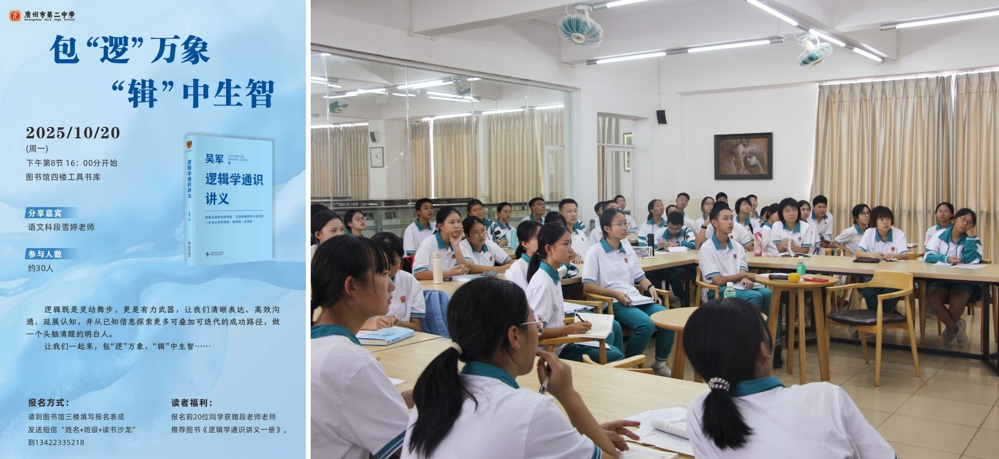 空山新雨浣轻尘,学海堂前秋色澄。2025年10月20日午后,当金风轻拂过工具书库的窗棂,第75期读书沙龙在思维的星火中如期开启。这场以“包‘逻’万象,‘辑’中生智”为主题的思想之旅,在语文科段雪婷老师的精心引领下,为同学们开启了一扇通往逻辑殿堂的智慧之门。阳光透过玻璃,在书架间投下斑驳光影,仿佛为这场思想盛宴铺就了一条光芒跃动的认知之路。