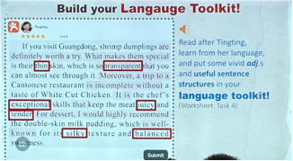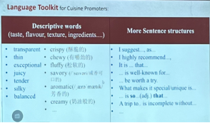 在听力文本可视化后,何老师引导学生从文本中提炼食物描述类词汇(如 transparent 透明的、juicy 多汁的、silky 丝滑的)与推荐类句式,构建“Language Toolkit”,让学生在后续表达中有“料”可用、有“式”可依。