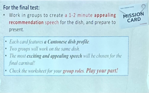 最终任务“Cuisine Promoters Final Test”以真实情境为依托:学生分组抽取“粤菜推广任务卡”,分工完成菜品简介、推荐理由阐述、演讲整合等角色任务,需在1-2分钟内呈现兼具吸引力与说服力的菜品推荐演讲。展示环节后,学生依据“语言词汇、清晰度与流利度、吸引力”三维评价标准进行同伴互评,教师针对性点评鼓励,实现“输入—内化—输出—反馈”的完整闭环。课后作业则延伸为制作菜品推广海报,通过跨媒介任务巩固语言收获、激发创新思维。