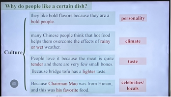 进入听力训练前,蓝老师设置翻译任务“为什么湖南人喜欢吃辣?”,精准对接高考听说考试题型,引导学生带着问题聆听材料(重复播放两次以辅助细节捕捉)。听力结束后,师生共同梳理答案,从性格、气候、文化、口味、名人影响等维度,深度总结“人们偏爱某类食物的核心原因”,让学生深刻理解食物背后的文化逻辑。