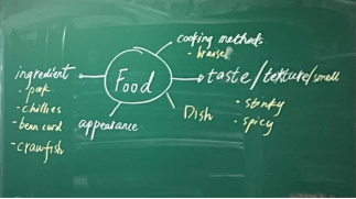 在听力文本可视化后,何老师引导学生从文本中提炼食物描述类词汇(如 transparent 透明的、juicy 多汁的、silky 丝滑的)与推荐类句式,构建“Language Toolkit”,让学生在后续表达中有“料”可用、有“式”可依。