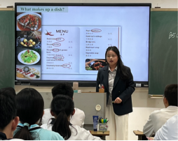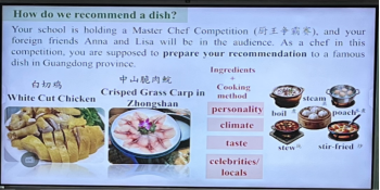 最终口语任务紧扣学生生活:假设学校举办“厨王争霸赛”,需向外国友人 Anna 和 Lisa 推荐一道广东名菜。学生结合课堂所学的语言支架与生活经验,分组完成推荐演讲。展示中,学生大方自信,既灵活运用了课堂积累的表达,又融入了对本土美食文化的理解,实现了“学用结合”的教学目标。