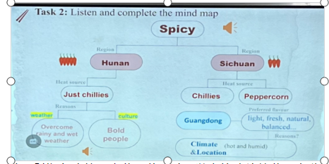 Task 2(思维导图填充):学生聆听材料,对比湖南、四川、广东三地饮食的“辣度来源”与“偏好原因”,从气候、文化等维度梳理食物与地域文化的关联,让课堂从语言学习延伸至文化认知;